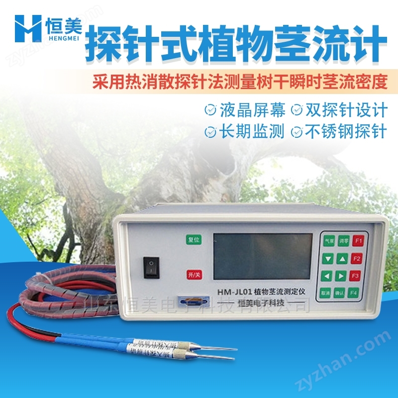 探針式植物莖流測量儀采用法國學(xué)者Granier在20世紀(jì)80年代后發(fā)明的一種測定SapFlow的新方法,即熱消散探針法(恒定熱流傳感器法)。該方法的數(shù)據(jù)采集具有準(zhǔn)確穩(wěn)定的特點,而且可以連續(xù)不間斷的讀取數(shù)據(jù),因而數(shù)據(jù)具有系統(tǒng)性。該測定系統(tǒng)由一對長33mm的熱消散探針組成,安裝時將探針上下相隔10cm-15cm插入樹木的邊材中,上方的探針纏繞電阻絲,供以直流電加熱,下方探針不加熱,保持與周圍邊材組織的溫度相同,兩探針的溫差變化反應(yīng)樹木的液流密度。