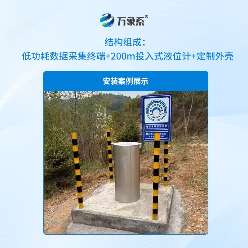 結構組成:一體式地下水位監(jiān)測系統低功耗數據采集終端+200m投入式液位計+定制外殼