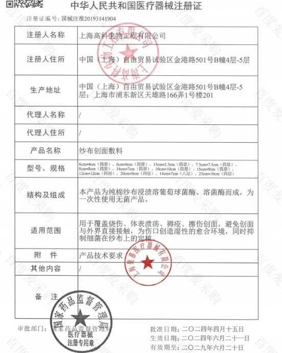 用于覆蓋燒傷、體表潰瘍、褥瘡、擦傷創(chuàng)面,避免創(chuàng)面與外界直接接觸,為傷口創(chuàng)造濕性的愈合環(huán)境,同時抑制細菌在紗布上的定植。