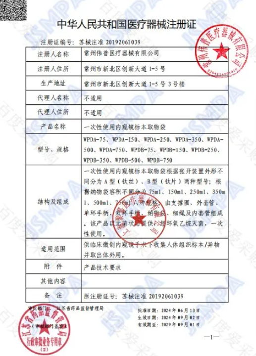 一次性使用內窺鏡標本取物袋根據張開裝置外形不同分為A型(鈦絲)、B型(鈦片)兩種型號;根據納物袋容積不同分為75ml、150ml、250ml、350ml、500ml、750ml六種規(guī)格;由支撐圈、外套管、單環(huán)手柄、雙環(huán)手柄、納物袋、細繩及內套管組成。該產品以無菌狀態(tài)提供,經環(huán)氧乙烷滅菌,一次性使用。