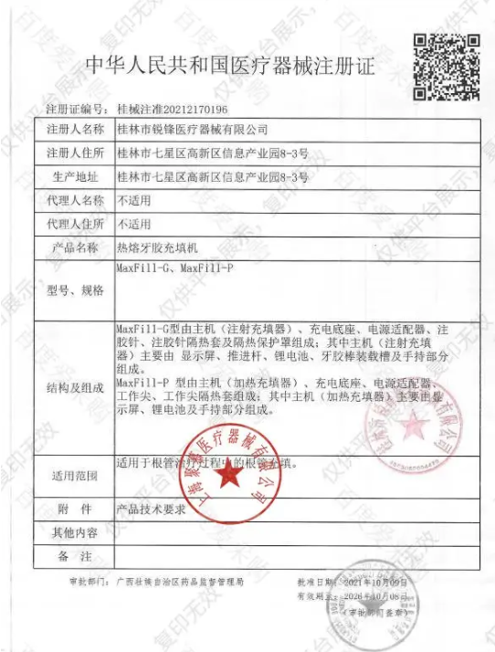 MaxFill-G型由主機(jī)(注射充填器)、充電底座、電源適配器、注膠針、注膠針隔熱套及隔熱保護(hù)罩組成;其中主機(jī)(注射充填器)主要由 顯示屏、推進(jìn)桿、鋰電池、牙膠棒裝載槽及手持部分組成。