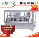 果酒生產(chǎn)線采用高溫?zé)峁嘌b和無(wú)菌冷灌裝兩種方法,制作果汁、茶飲料的工藝要求嚴(yán)格,從PET瓶灌裝的工藝技術(shù)、生產(chǎn)線的操作性、飲品品質(zhì)等的綜合比較來(lái)看,選用熱灌裝工藝是較為經(jīng)濟(jì)和可靠的。熱灌裝要求果汁、茶飲料經(jīng) UHT瞬時(shí)超高溫滅菌后保持在85℃~95℃之間的一個(gè)定值,且在很短的時(shí)間內(nèi)灌裝結(jié)束,屬高溫灌裝。由于熱灌裝要具備高溫灌裝、滿(mǎn)口灌裝的功能,這就要求配有自動(dòng)循環(huán)系統(tǒng),便于低溫物料循環(huán)加熱及CIP循環(huán)清洗??ㄆ靠诠嘌b及輸送。耐熱PET瓶在高溫灌裝時(shí),雙向拉伸PET加熱會(huì)收縮,收縮率一般為1%~3%,而瓶頸部位強(qiáng)度,這就要求灌裝時(shí)采用卡瓶口定位方式合理,避免瓶身受到外力作用發(fā)生變形。同時(shí),灌裝完好的飲品,采用卡瓶口輸送,可避免瓶身受到振動(dòng)和擠壓物料的溢出。