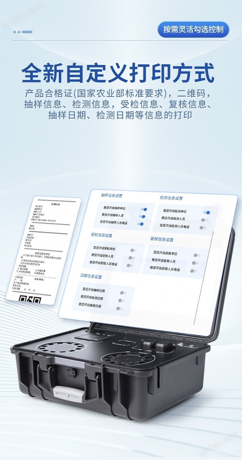 14.1、全新打印系統(tǒng):內(nèi)置全新打印機(jī),新創(chuàng)自定義打印方式,可按需靈活勾選控制:產(chǎn)品合格證(國(guó)家農(nóng)業(yè)部標(biāo)準(zhǔn)要求),二維碼,抽樣信息、檢測(cè)信息,受檢信息、復(fù)核信息、抽樣日期、檢測(cè)日期等信息的打印。