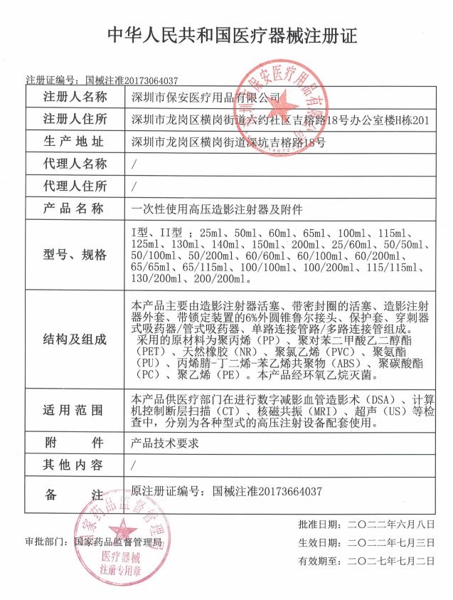本產(chǎn)品供醫(yī)療部門在進(jìn)行數(shù)字減影血管造影術(shù)(DSA)、計算機(jī)控制斷層掃描(CT)、核磁共振(MRI)、超聲(US)等檢查中,分別為各種型式的高壓注射設(shè)備配套使用。