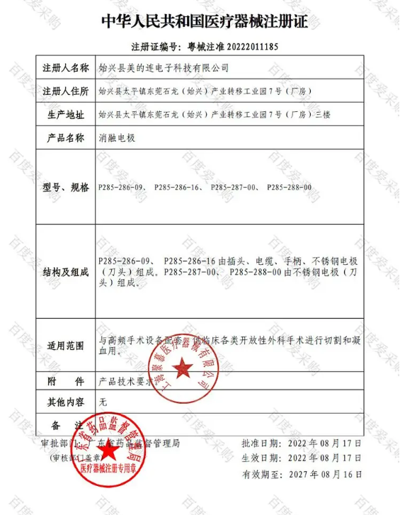 P285-286-09、P285-286-16由插頭、電纜、手柄、不銹鋼電極(刀頭)組成。P285-287-00、P285-288-00由不銹鋼電極(刀頭)組成。