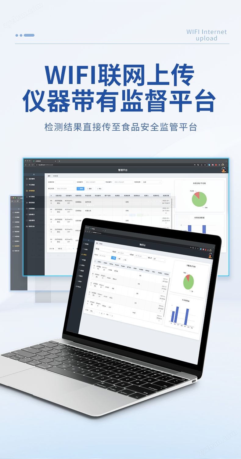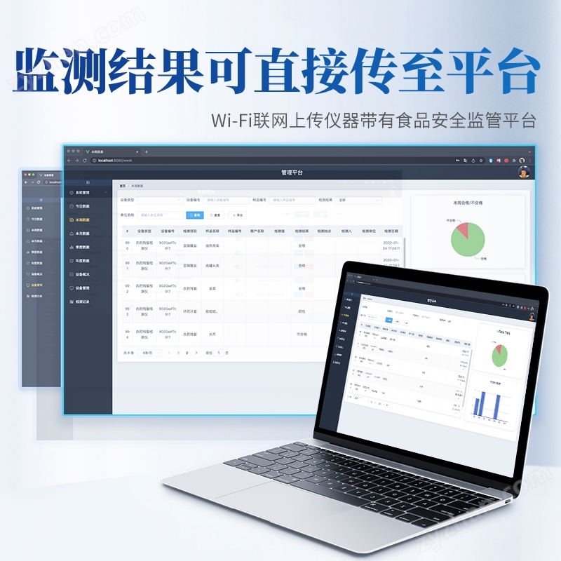 4、儀器帶有監(jiān)管平臺(tái),數(shù)據(jù)可局域網(wǎng)和互聯(lián)網(wǎng)數(shù)據(jù)上傳,檢測(cè)結(jié)果直接傳至食品安全監(jiān)管平臺(tái)。進(jìn)行區(qū)域食品安全監(jiān)管及大數(shù)據(jù)分析處理與數(shù)據(jù)統(tǒng)計(jì),檢測(cè)區(qū)域食品安全長(zhǎng)短期動(dòng)態(tài),達(dá)到食品安全問(wèn)題預(yù)估、預(yù)警