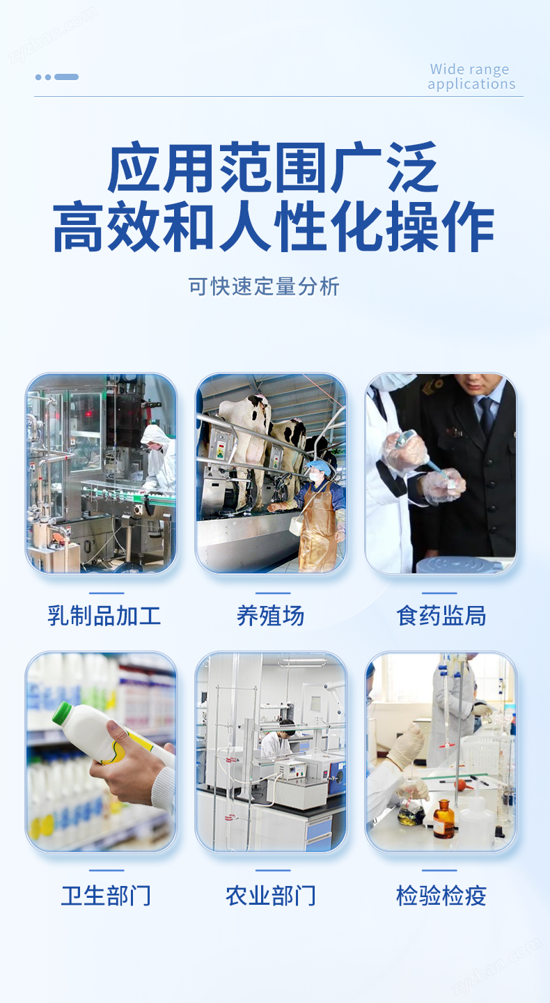 奶制品三聚氰胺含量測(cè)定儀可快速定性檢測(cè)奶粉、純牛奶、酸奶、酸乳、果乳等奶制品、其它食品以及飼料中的三聚氰胺是否超標(biāo)。從原料采購(gòu)到成品檢驗(yàn)均可使用,奶制品三聚氰胺含量測(cè)定儀廣泛應(yīng)用于乳制品加工、養(yǎng)殖場(chǎng)、食藥監(jiān)局、衛(wèi)生部門(mén)、農(nóng)業(yè)部門(mén)、檢驗(yàn)檢疫等部門(mén)使用。