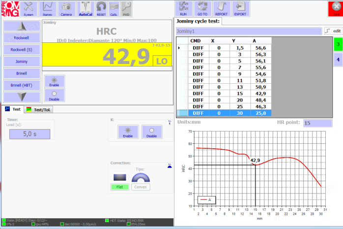每個(gè)工件都自動(dòng)單獨(dú)生成測(cè)試報(bào)告,可進(jìn)行1面,2面和4面測(cè)試,含Y軸距離-硬度值表格,端淬曲線亦可對(duì)4個(gè)工件同時(shí)進(jìn)行端淬測(cè)試