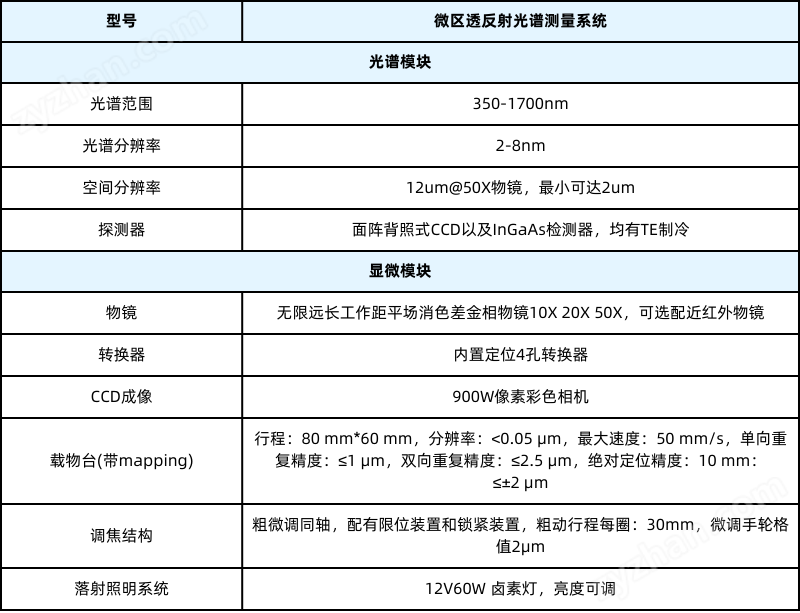 ◆ 模塊設(shè)計(jì):通過(guò)在顯微鏡中加裝拓展模塊實(shí)現(xiàn)光譜測(cè)量,同時(shí)可在客戶現(xiàn)有顯微鏡基礎(chǔ)上定制相應(yīng)檢測(cè)模塊?!?共焦設(shè)計(jì):光源光路與光譜儀接收光路共軸,獨(dú)特的共焦設(shè)計(jì)使得測(cè)量“所見(jiàn)即所得",并且系統(tǒng)的雜散光可以得到有效抑制。◆ 寬光譜檢測(cè)范圍:搭配如海光電的光纖光譜儀,可實(shí)現(xiàn)350~1700nm寬光譜測(cè)量?!?靈活選配與升級(jí):該系統(tǒng)除可實(shí)現(xiàn)透反射測(cè)量外,同時(shí)可根據(jù)客戶需求在此基礎(chǔ)上添加特定測(cè)量模塊從而實(shí)現(xiàn)透反射+拉曼+熒光多光譜測(cè)量?!?高精度測(cè)量:自動(dòng)移動(dòng)平臺(tái)最小步進(jìn)1μm,可實(shí)現(xiàn)微小區(qū)域光譜掃描測(cè)量。* 光譜儀可根據(jù)客戶需求定制光譜范圍、分辨率等參數(shù)