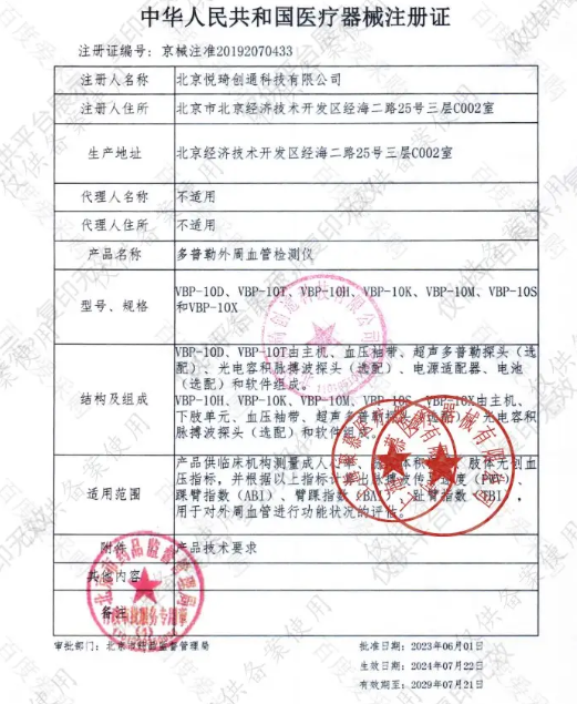 產(chǎn)品供臨床機(jī)構(gòu)測量成人心率、脈搏體積記錄、肢體無創(chuàng)血壓指標(biāo),并根據(jù)以上指標(biāo)計(jì)算出脈搏波傳導(dǎo)速度(PWV)、踝臂指數(shù)(ABI)、臂踝指數(shù)(BAI)、趾臂指數(shù)(TBI),用于對外周血管進(jìn)行功能狀況的評估。